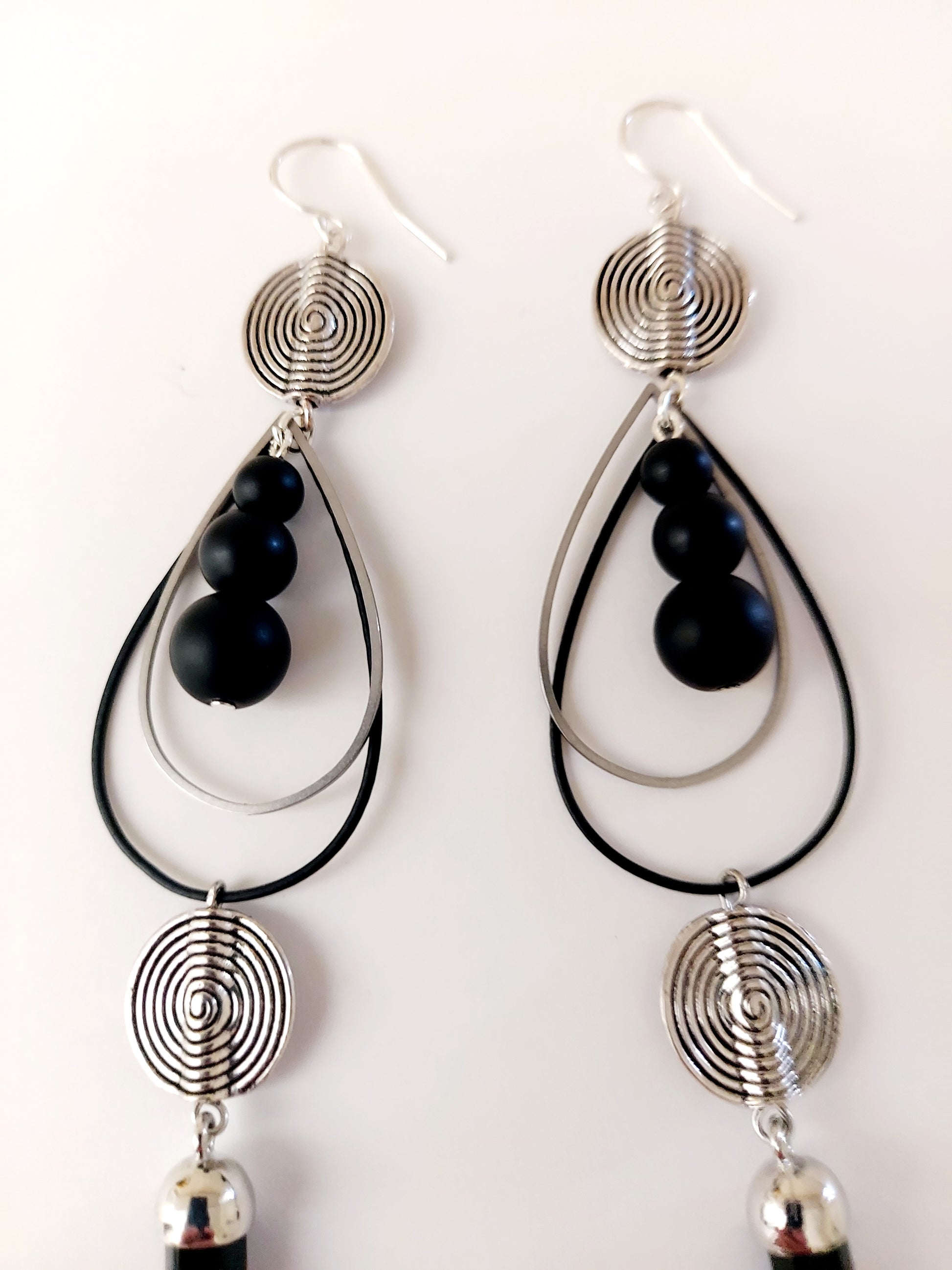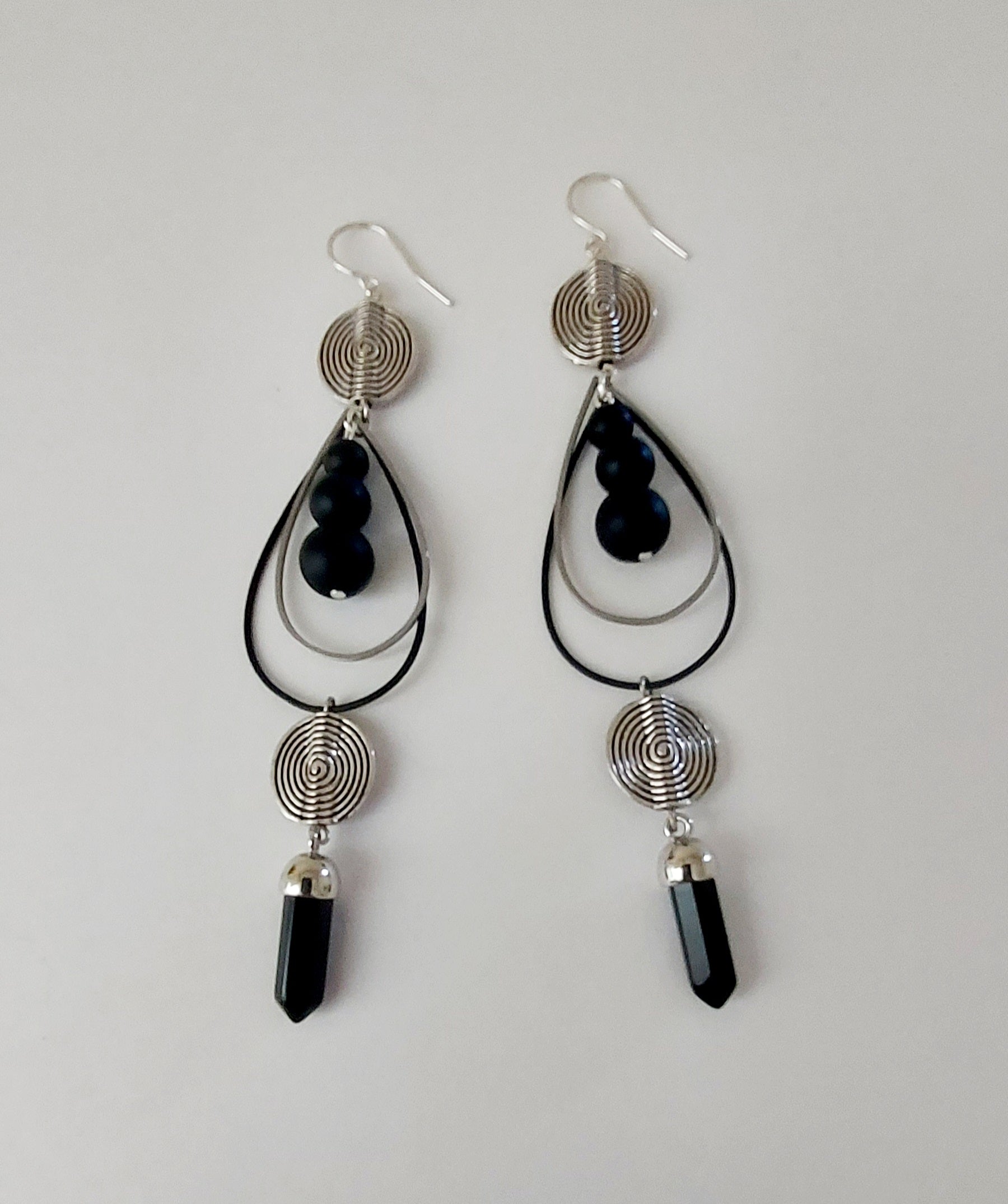 These exquisite earrings feature a sophisticated combination of silver spiral beads, black and silver teardrop wire, and lustrous black glass beads, accented by crystal-cut black jasper stones. Measuring approximately 4 inches long, they offer a striking balance of elegance and bold design. The ear hooks are crafted from .925 sterling silver, ensuring durable comfort and hypoallergenic wear for sensitive ears. Perfect for those seeking a refined yet edgy accessory to elevate any ensemble.